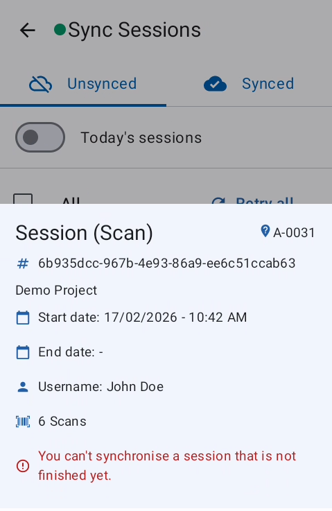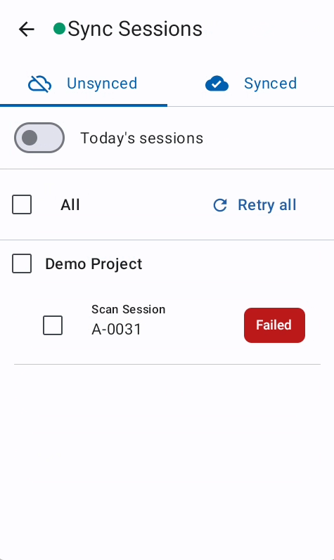 Under the tab "Unsynced", not synced sessions can be reviewed, the sync can be retried and sync errors be reviewed.