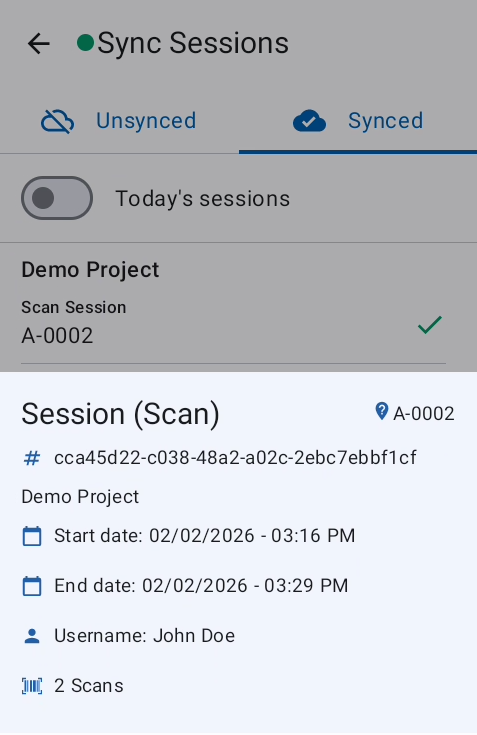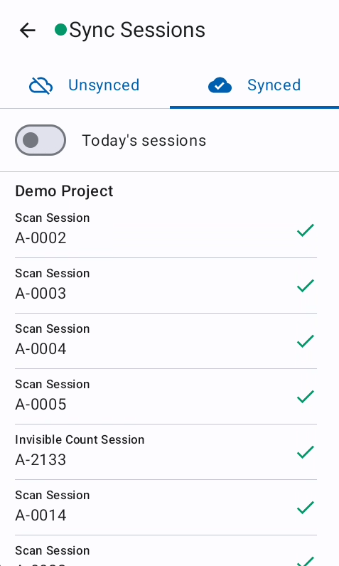 Under the tab "synced", already synced sessions can be reviewed. It also can be filtered by todays sessions.