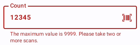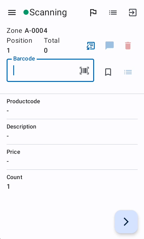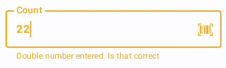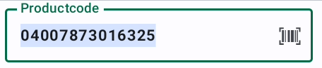 The green border of a field, together with the barcode scannable icon, indicates that the scanning a value will submit the current scan and use the scanned value as input for the first field of the next position. This allows the user to scan the next item and submit the previous scan in one step. Example: The cursor is on the "Count" field and having the green border and the Barcode icon. When the user scans the next product, the current position will be submitted/saved and the scanned barcode is used at the next position. This skip the manual scan submit.