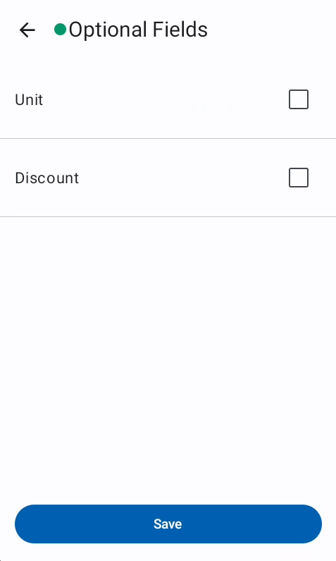 To enable optional fields, these have to be defined as an upcoming field depending on the current selected field. Example: From the scan flow config, the optional field "Discount" is defined after the Barcode step and before the the count step. If the cursor is on the "Count" field, the "Discount" can not be enabled. It can be enabled when the cursor is at the "Barcode" field.