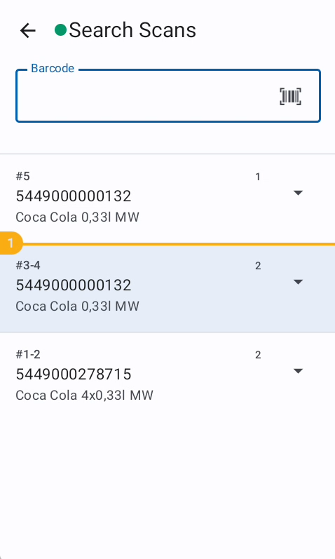 The scan list shows the already scanned positions of the same zone session. From this list it the count of each position can be changed or the shelf marker can be added. With the search a position can be found by scanning a barcode.