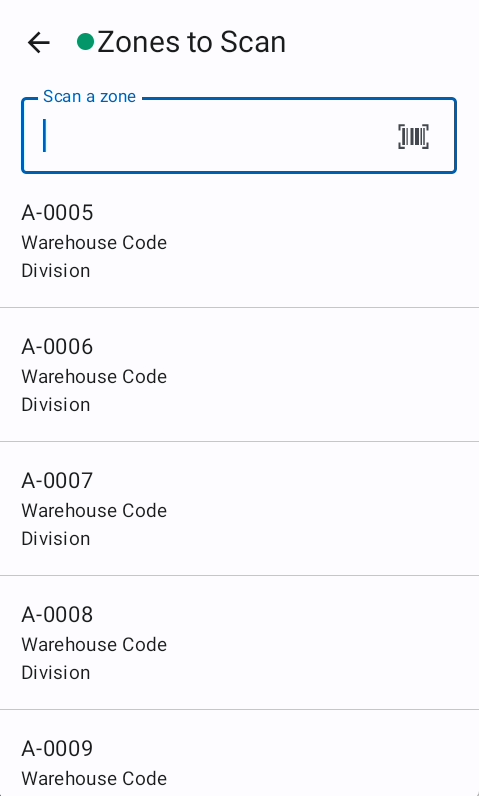 The "zones to scan" screen provides zone suggestions based on the last work of the user. It shows the five next not scanned zones from the last scanned zone. This is the suggested zone list and help the user finding the next zone to do. The user is not forced to select one of these.