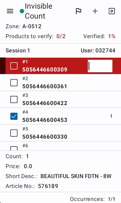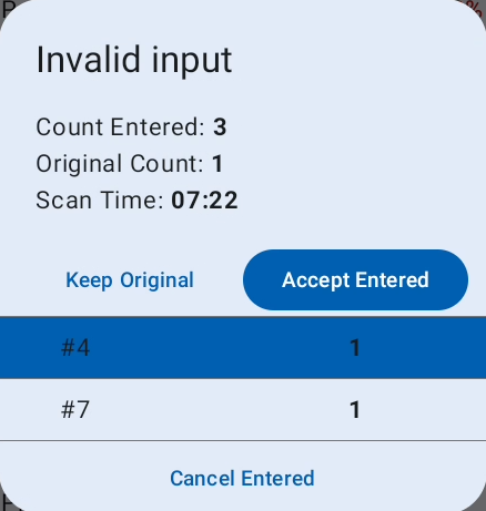 If the count was correct in the first or second attempt the UI keeps the count and marks the scan as verified. If the count on the second attempt is still wrong a pop up opens with the original count and also showing other occurrence of the same product and the scan time.