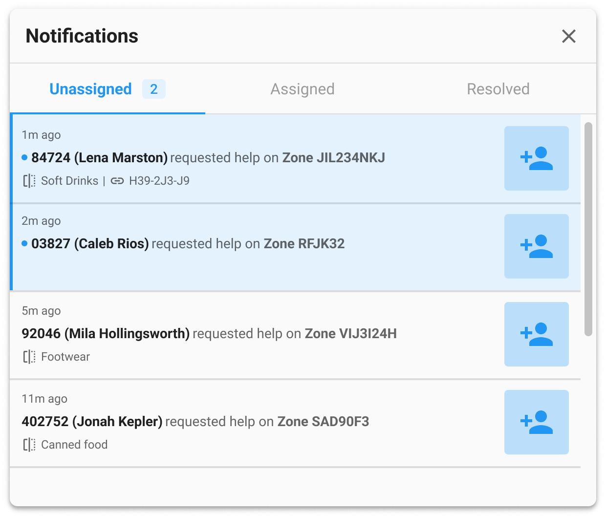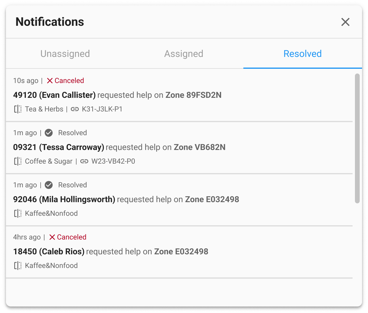 | Unassigned | Default state as soon as a help request comes through from a scanner in the field. | Assign the task to you to handle. | |