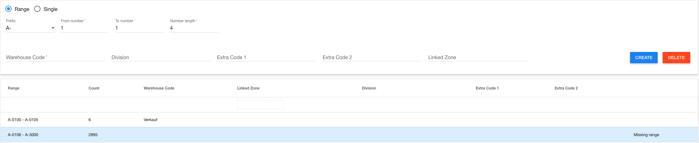 - Range Mode: Bulk create sequential zones with prefix, numbering, and padding
