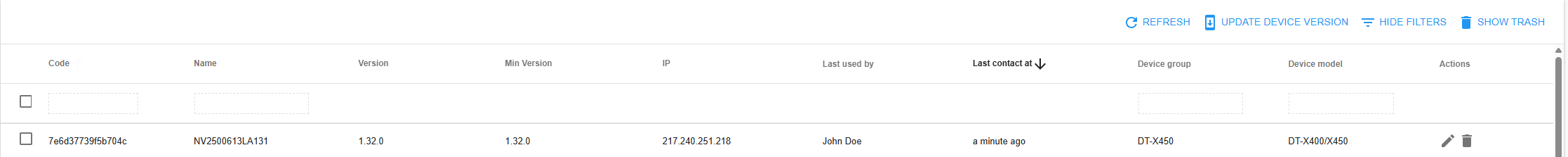 Table Columns: Description Select Select box for bulk operations Code Device identifier Name Name of the device Version Current version of the Stripes app Min Version Required minimum version IP Last contact IP adress Last used by Last user login at the device Last contact at Timestamp of the last server contact Device group Belonging device group Device Model Device model Actions (Edit, Delete) Actions to change device values -