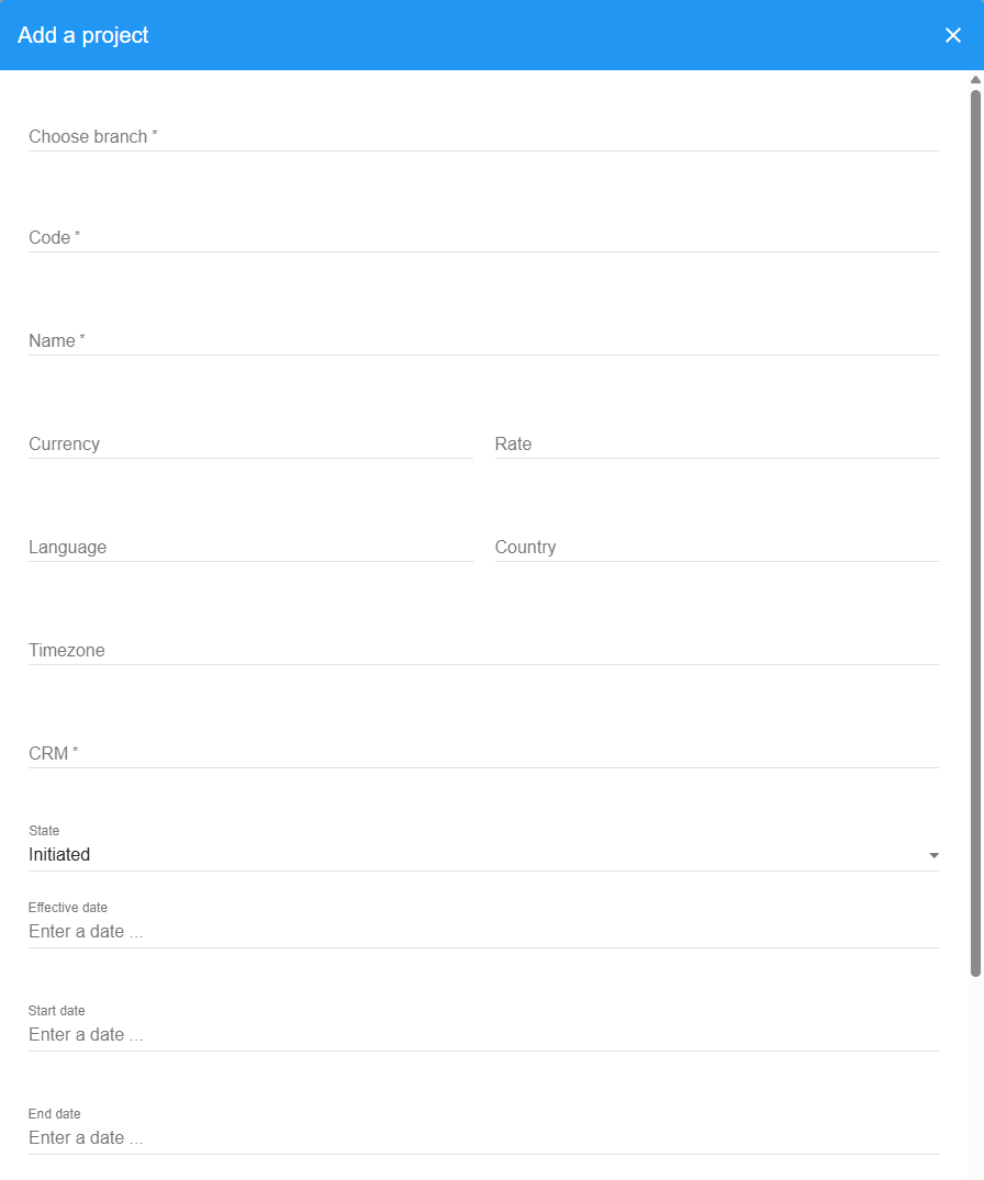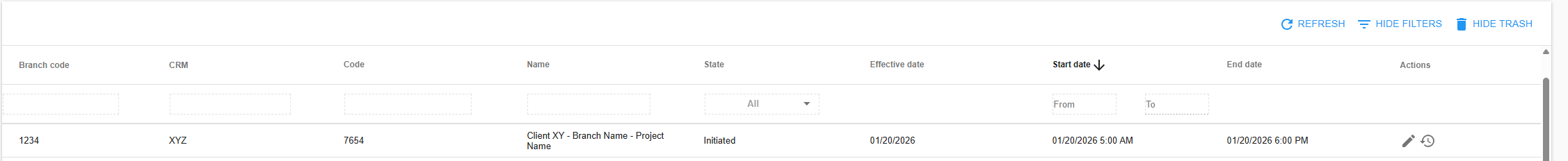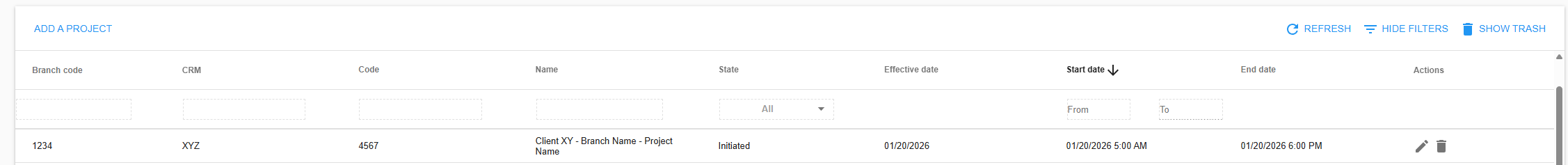 Table Columns: Description Branch Code Belonging branch code CRM ERP/CRM reference Code Project code Name Client name - Branch name - Project name State Current state of the project Effective date Effective date of the project Start date Start date of the project End date End date of the project Actions (Edit, Delete) Actions to change project values -